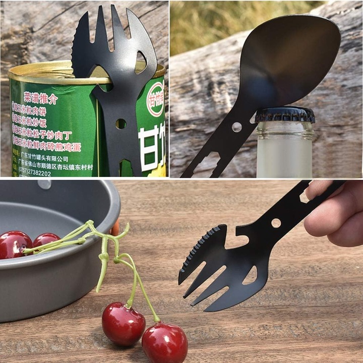 Fabricat din otel inoxidabil de inalta duritate, tacamul este rezistent la uzura, lovituri si conditii meteo variate. Designul compact il face usor de transportat in buzunar, in rucsac sau intr-o geanta mica, iar lungimea optima a manerului permite utilizarea confortabila a fiecarei functii. Integreaza instrumente utile precum lingura, furculita, cutit, deschizator de sticle si deschizator de conserve, fiind o solutie sigura si eficienta in orice situatie.