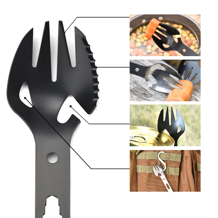 • 5 functii intr-un singur instrument: lingura, furculita, cutit, deschizator de sticle si conserve.