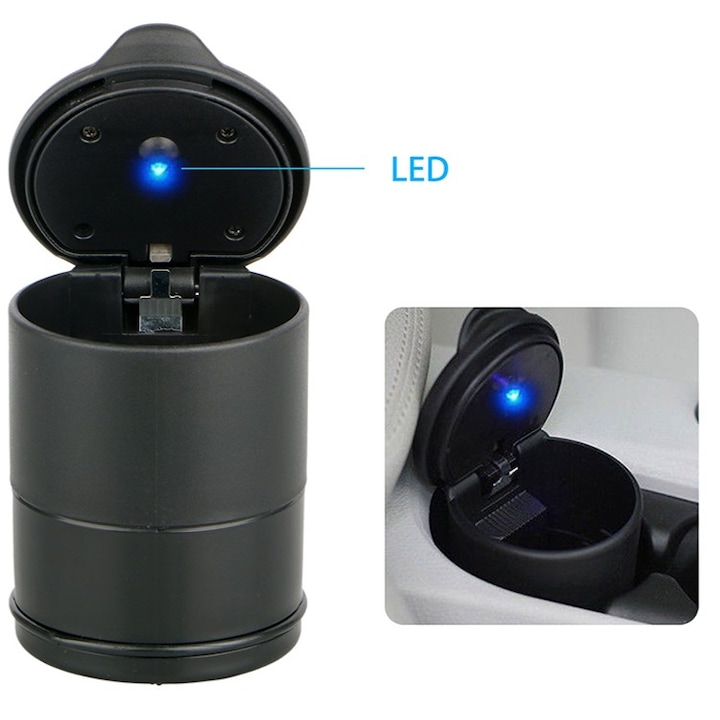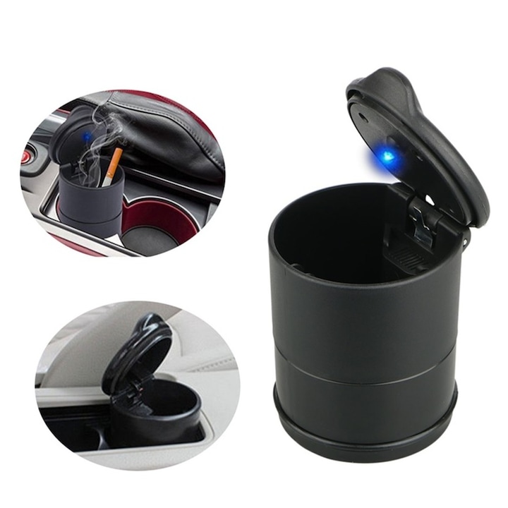 Aceasta scrumiera auto universala cu LED este un accesoriu practic si elegant, conceput pentru a mentine curatenia si confortul in interiorul oricarui autovehicul. Datorita dimensiunilor compacte, se potriveste perfect in suportul pentru pahare, fiind ideala atat pentru fumatori, cat si pentru utilizare ca mini cos de gunoi pentru resturi mici, ambalaje sau capace.