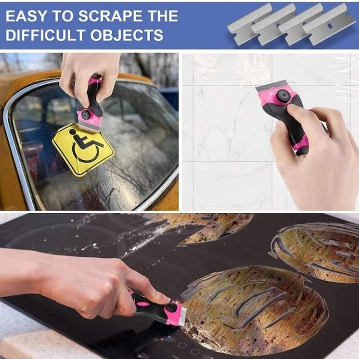Racleta multifunctionala, 2 capete, maner ergonomic, curatare ceramica, sticla, 10 lame plastic, 10 lame metalice, negru/roz
