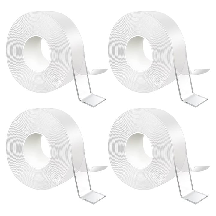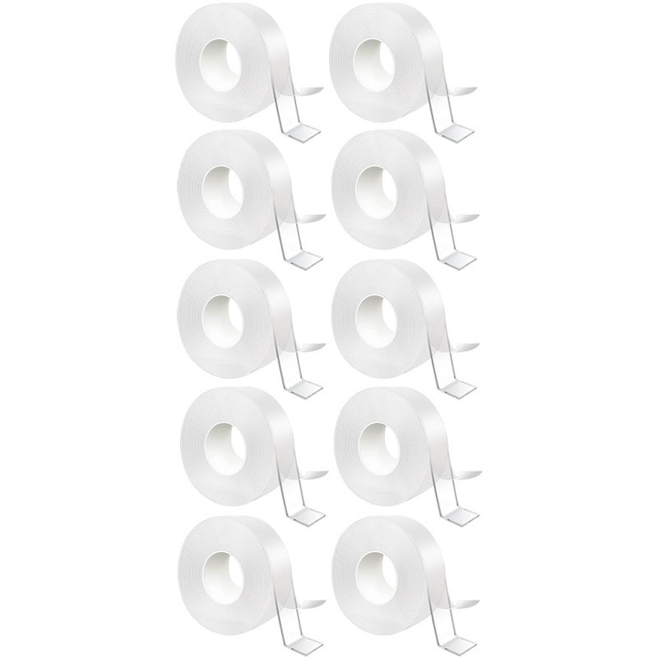 Set 10 benzi dublu adezive transparente, 5 metri pe rola, siliconice, rezistente la apa, reutilizabile, adeziv puternic, aplicabile pe diverse suprafete