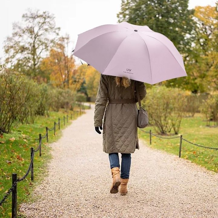 Designul pliabil transforma umbrela intr-un accesoriu usor de transportat, avand o lungime de doar 26 cm atunci cand este inchisa. Astfel, poate fi depozitata cu usurinta in geanta, rucsac sau portbagaj, fara a ocupa mult spatiu. Greutatea redusa de doar 280 g o face confortabila pentru transport zilnic, fara a crea disconfort.