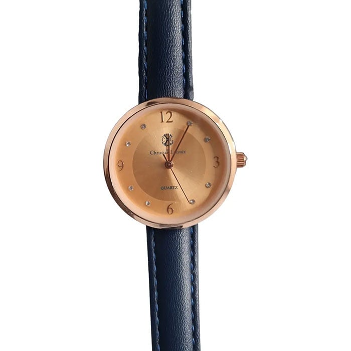 Un ceas cu stil inspirat din zona haute couture, potrivit pentru orice ocazie – de la look-uri elegante de seară la ținute smart casual. Carcasa este din aliaj de zinc, finisată în nuanță aur roz, cu diametru de circa 3,3 cm, iar pe marginea cadranului sau în zona acestuia sunt plasate pietre de sticlă, pentru un plus de strălucire și rafinament. Cureaua din PU este comodă și ușor de purtat, cu lungime totală de 23,5 cm, suficientă pentru majoritatea încheieturilor, iar lungimea curelei în sine este 17,5 cm, ceea ce oferă un echilibru bun între stabilitate și confort. Totodată, mecanismul este pe quartz, cu baterie tip pastilă care se poate înlocui, astfel încât ceasul să rămână funcțional pe termen lung, fără complicații.