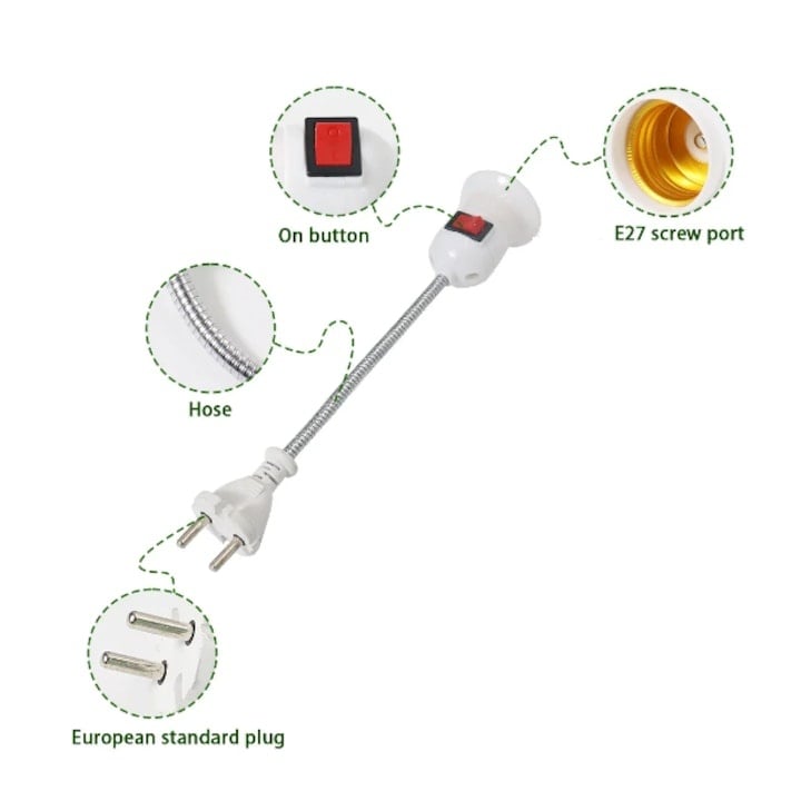 Setul este gata de utilizare imediat dupa conectare, fara montaj suplimentar. Intrerupatorul clasic este usor accesibil, permitand controlul rapid al luminii, iar cablul flexibil asigura orientarea optima indiferent de pozitia prizei.