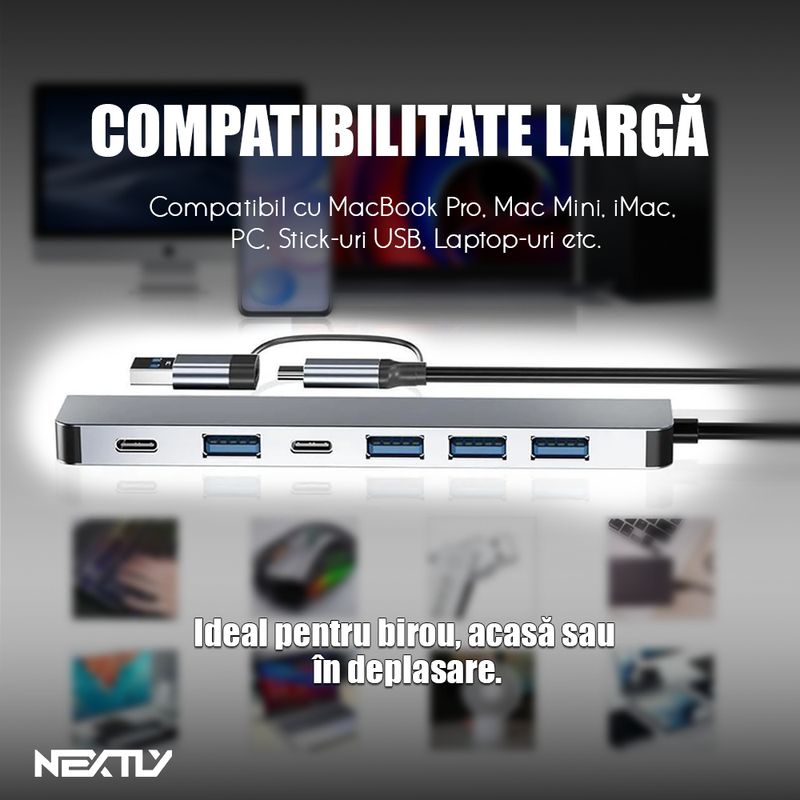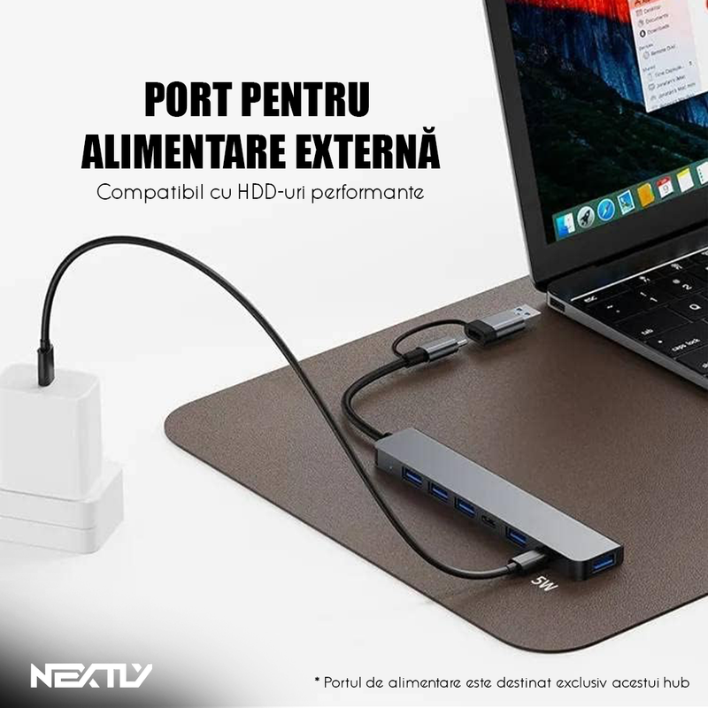 💻 Dispozitivul dispune de 7 porturi active ce includ: 1 port USB 3.0 cu viteza ridicata pentru transfer rapid de fisiere, 3 porturi USB 2.0 pentru tastaturi, mouse-uri sau stick-uri de memorie si 2 porturi USB-C PD (Power Delivery) pentru incarcarea dispozitivelor compatibile. Alimentarea se face direct prin USB / USB-C, fara necesitatea unui adaptor extern.