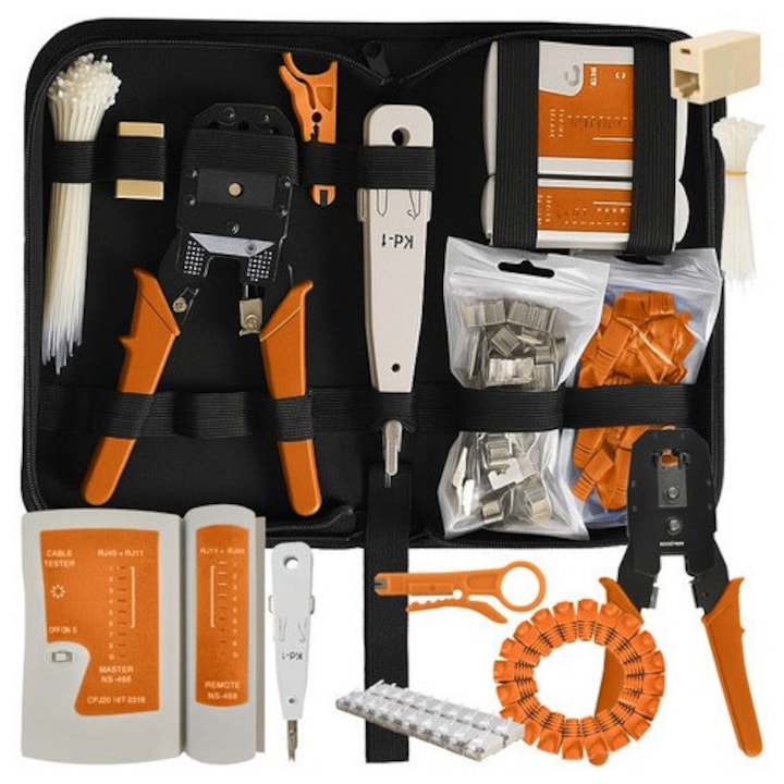 Toate accesoriile sunt organizate intr-o husa compacta cu fermoar, usor de transportat si depozitat. Compatibilitatea cu mufe RJ45 si RJ11 permite utilizarea kitului in retele LAN, sisteme de telefonie fixa sau cablaje structurare pentru birouri si locuinte.