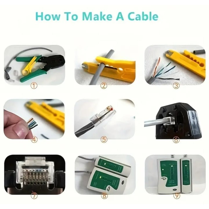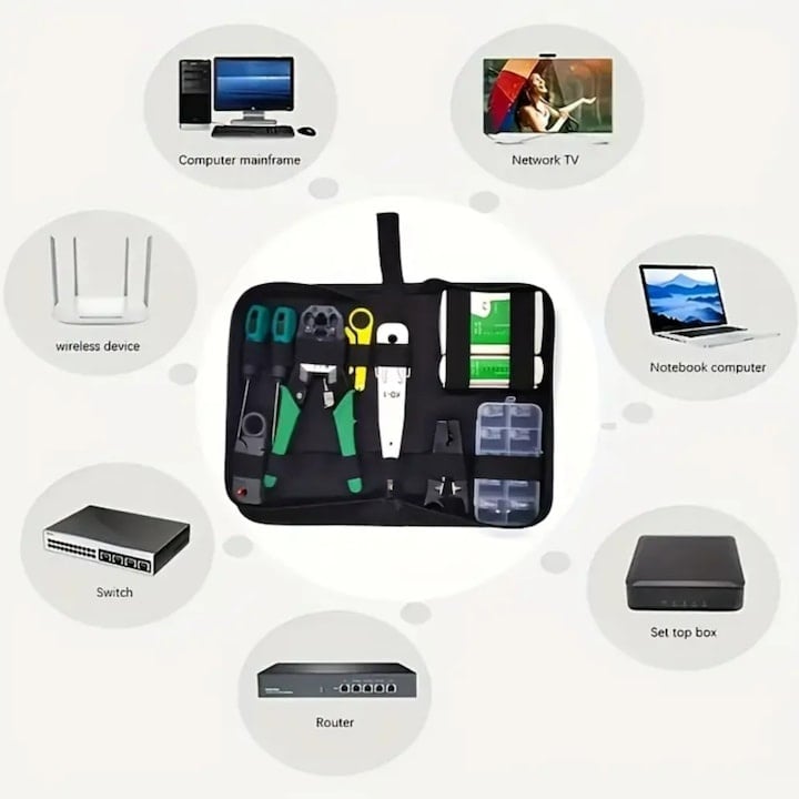 Kitul complet de retelistica este solutia perfecta pentru instalare, testare si reparare a cablurilor de retea sau telefonie, atat in mediul profesional, cat si pentru utilizatorii pasionati de proiecte DIY. Conceput pentru lucrari LAN, acest set contine toate instrumentele necesare pentru mufare, verificare si intretinerea conexiunilor, fiind organizat intr-o geanta compacta si rezistenta, ideala pentru transport si depozitare.