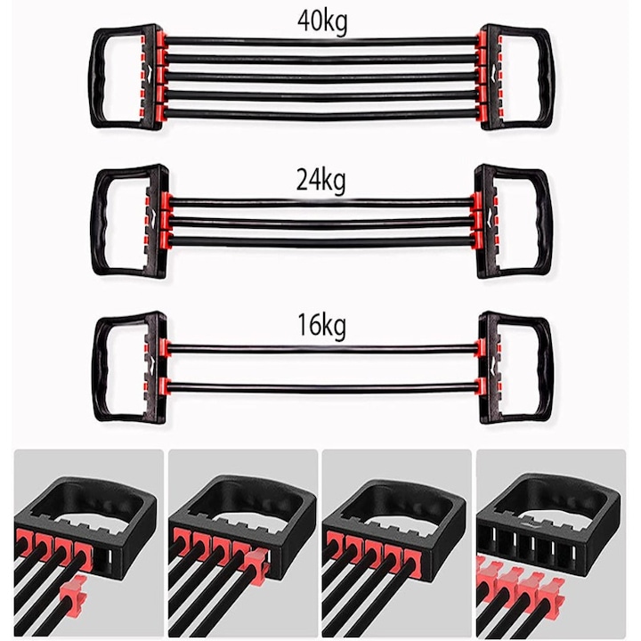 Acest extensor cu 5 benzi elastice de rezistenta este conceput pentru antrenamente complete de forta, tonifiere si stretching, fiind potrivit atat pentru incepatori, cat si pentru utilizatori avansati. Dispozitivul permite lucrul simultan sau individual al principalelor grupe musculare, precum piept, brate, umeri, spate si zona superioara a corpului, oferind o alternativa practica la greutatile clasice.
