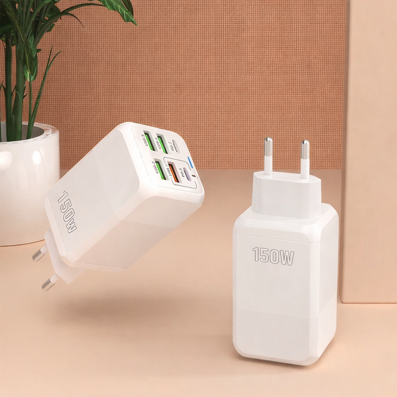 Incarcator retea 150W USB-C si USB-A 6 porturi fast charge PD universal telefon smartwatch alb compact