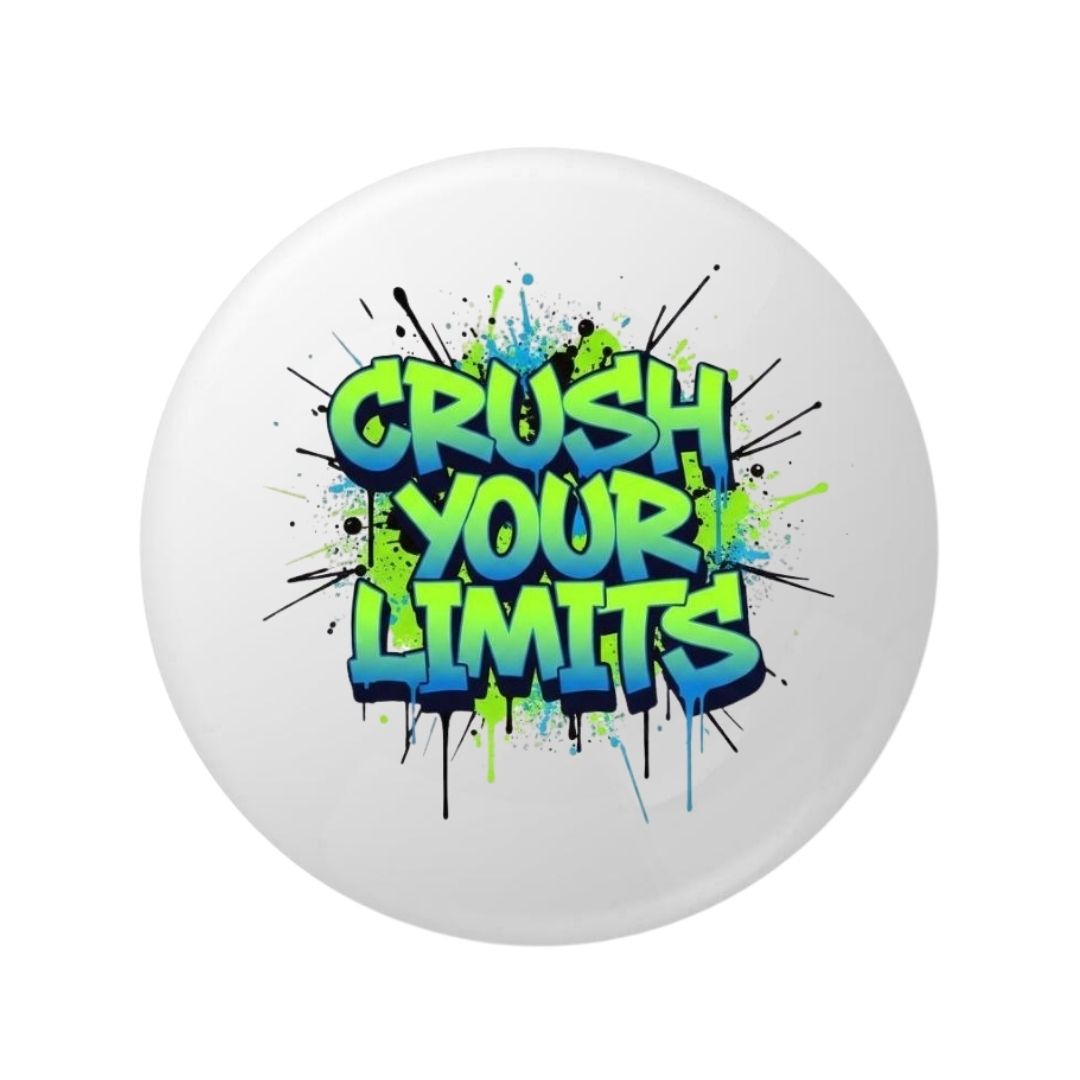Insigna rotunda cu mesajul „Crush Your Limits” este un accesoriu motivational cu design urban si energic, destinat persoanelor care isi doresc sa depaseasca barierele si sa isi urmeze obiectivele. Stilul grafic tip graffiti, cu efect de stropi de culoare verde si albastru, transmite dinamism si forta interioara.
