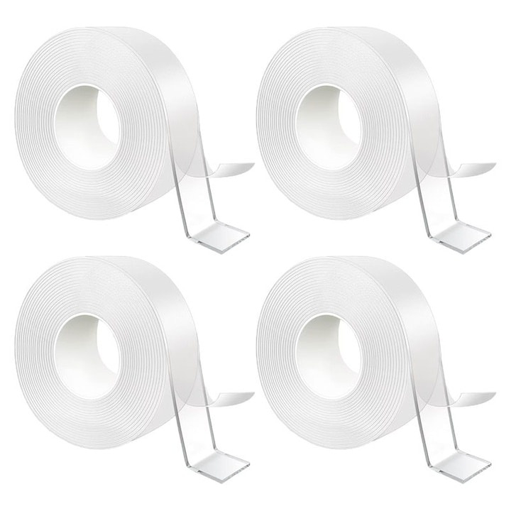 Set 4 benzi dublu adezive transparente, 5 metri pe rola, siliconice, flexibile, rezistente la apa, reutilizabile, nu lasa urme, aplicabile pe diverse suprafete