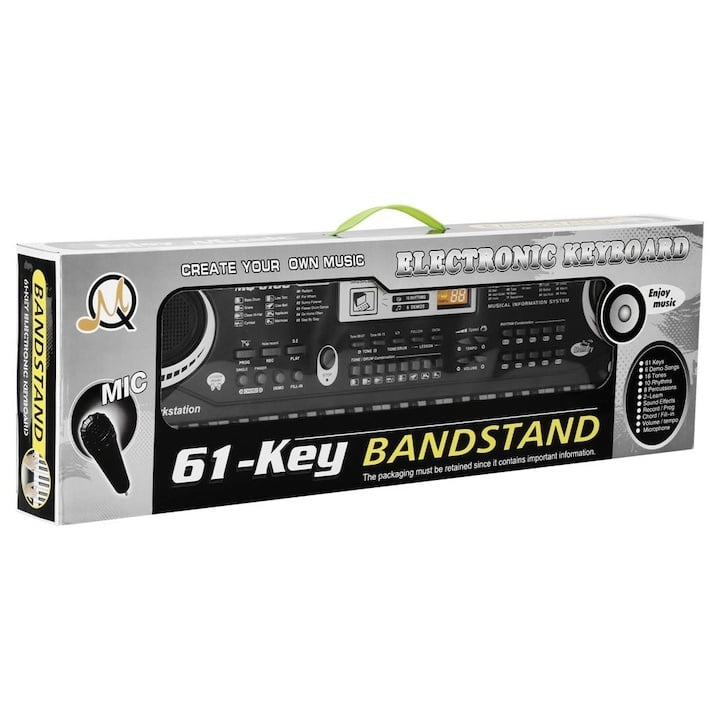 Orga electronica pentru copii, cu microfon, 61 de chei, modul de invatare, 16 tonuri, 10 ritmuri, functie de inregistrare, alimentare USB sau baterii, 54 x 17 x 5 cm, negru