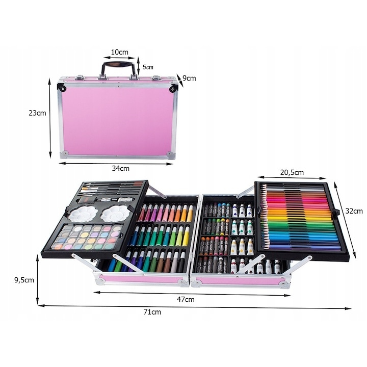 Toate piesele sunt organizate perfect intr-o gentuta rezistenta, tip geamantan, prevazuta cu maner ergonomic si sistem de inchidere sigur. Designul compact permite transportul si depozitarea usoara, iar compartimentele interioare mentin fiecare accesoriu la locul sau. Ideal pentru utilizare acasa, la scoala sau in calatorii, acest set este potrivit atat pentru copii, cat si pentru adultii pasionati de desen si pictura.
