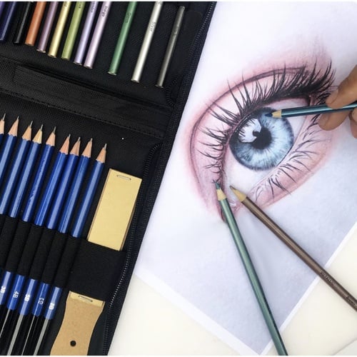 Setul contine creioane grafit cu duritati variate, creioane colorate, carbune, estompe, radiere si accesorii utile pentru detalii fine, umbre si evidentiere. Toate piesele sunt organizate intr-o husa textila rezistenta, cu compartimente elastice, care asigura protectie si transport facil.