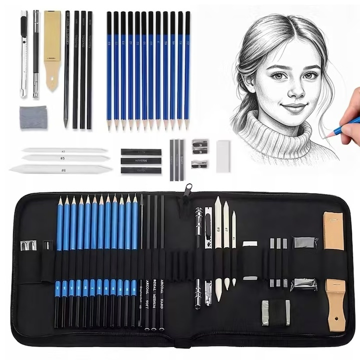 Set profesional pentru schite in creion, 35 piese, bloc desen, creioane, carbune, radiere, ascutitori, mapa depozitare