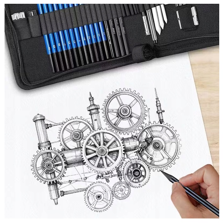 Set complet pentru desen si schite in creion, organizat si usor de transportat