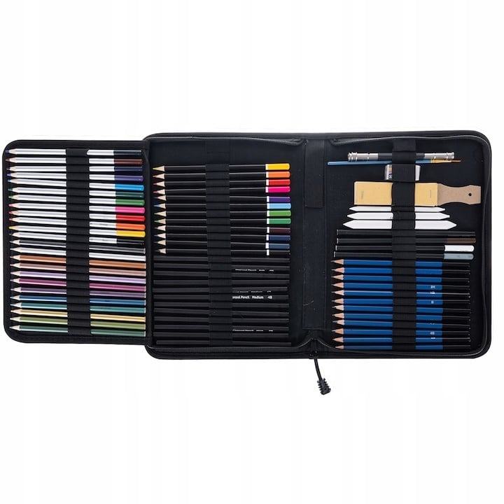 Trusa este organizata intr-o mapa eleganta si compacta, cu dimensiunile de 30 x 21 x 3,5 cm, ideala pentru depozitare si transport. Fiecare piesa are locul ei dedicat, ceea ce face setul extrem de practic si usor de folosit. Creioanele incluse acopera o gama larga de duritati si nuante, potrivite pentru contur, umbrire, detaliu sau efecte speciale.