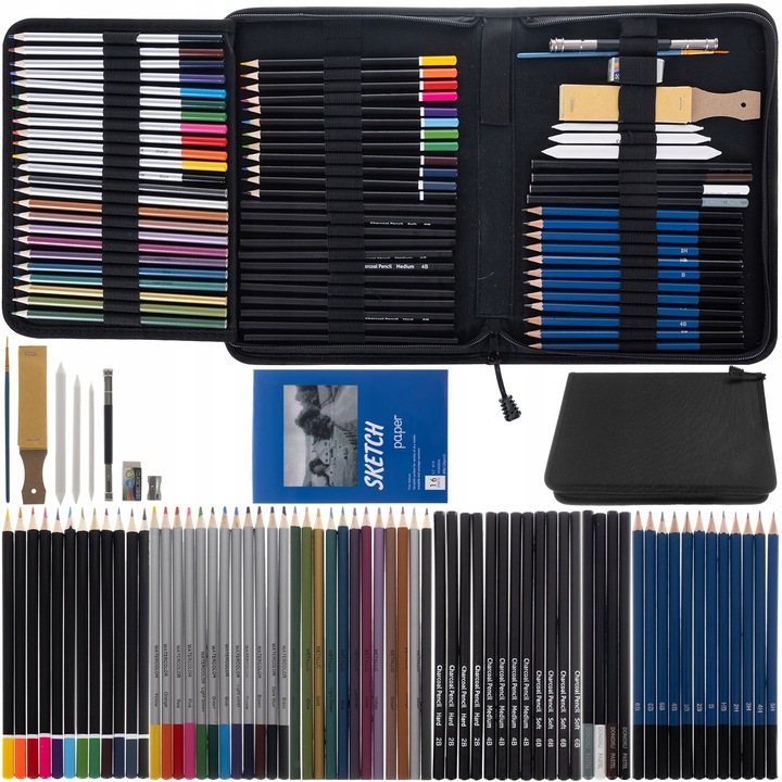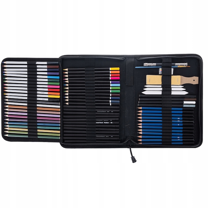 Acest set profesional pentru schite in creion cu 72 de piese este conceput pentru artisti, studenti si pasionati de desen care doresc versatilitate si precizie intr-un format portabil. Include o gama larga de creioane grafit, carbune, pastel, metalice si solubile in apa, potrivite pentru contur, umbrire, clarobscur si efecte speciale.