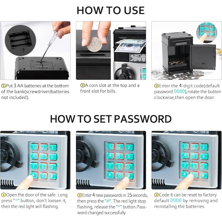 Fabricata din ABS durabil, fara miros si rezistent la uzura, pusculita este robusta si sigura pentru copii, fiind potrivita pentru utilizare zilnica. Modelul reproduce functionalitatea unui seif adevarat, cu un sistem de deschidere protejat prin parola din 4 cifre. La introducerea parolei corecte, LED-ul verde se aprinde, iar usa poate fi deschisa prin rotirea manerului. Parola implicita este „0000”, dar poate fi schimbata cu usurinta pentru un plus de realism si securitate.