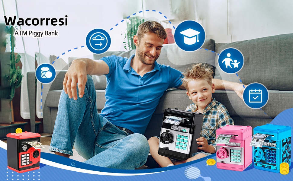 Unul dintre cele mai apreciate elemente ale acestei pusculite este sistemul Electronic Note Feeder, care permite introducerea automata a bancnotelor. Copiii pot depune bani simplu si rapid, iar mecanismul electric trage automat bancnota inauntru, imitand perfect un bancomat real. Monedele pot fi introduse prin fanta superioara, iar usa se poate deschide doar cu parola, garantand astfel siguranta economiilor.