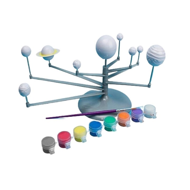 Partea creativa este completata de pictarea planetelor cu ajutorul paletei de 8 culori si a pensulei incluse. Copiii pot alege culorile reale sau pot crea combinatii proprii, personalizand fiecare planeta. Rezultatul final este un model 3D compact, cu latimea de 19 cm, care poate fi expus si folosit ca suport vizual pentru invatare continua.