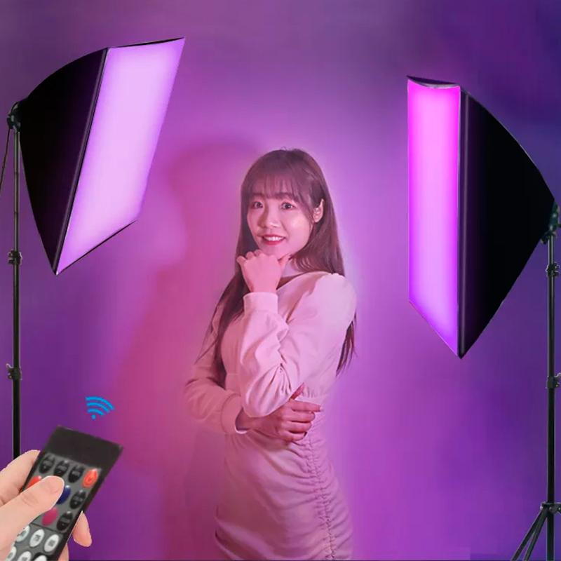 Kit 2 softboxuri 70x50 cm cu 2 becuri LED RGB 50W E27, telecomenzi si stative reglabile pana la 200 cm. Ideal pentru fotografie si video creativ.