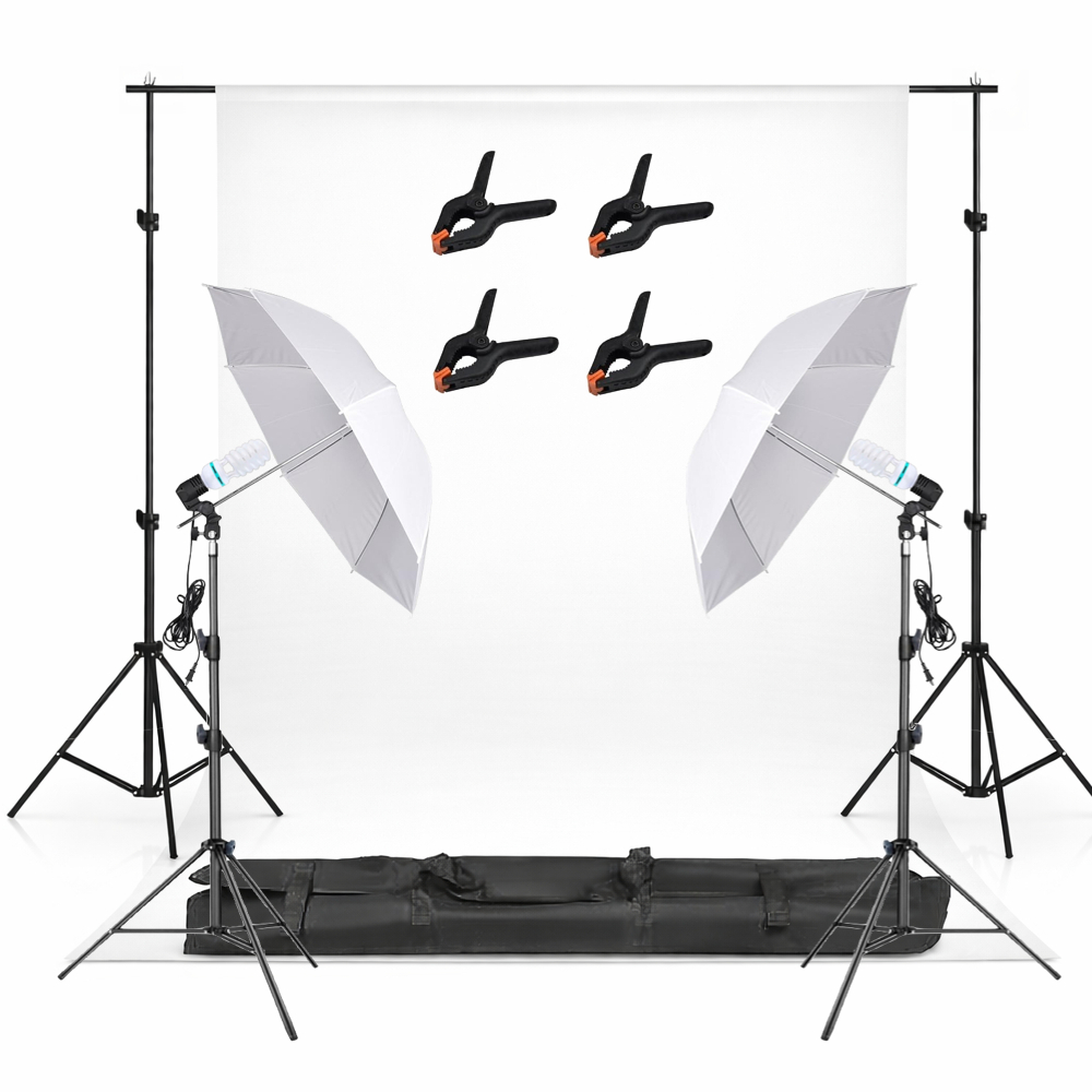 Kit profesional iluminare studio cu fundal alb, sistem 2x150W 5500K, stative 200 cm, umbrele reflexie si accesorii complete pentru fotografie si video