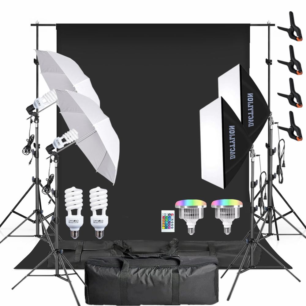 Kit studio foto video cu fundal negru, 2 softboxuri, 2 umbrele, 2 becuri fluorescente 45W 5500K si 2 LED RGB 45W, stative 200 cm si genti transport
