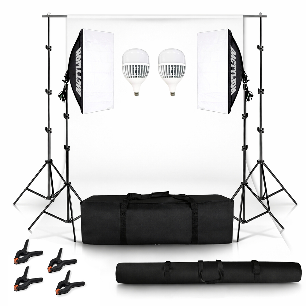Set studio iluminare cu 2 softbox, 2 becuri LED 6400K E27, white screen, clame pentru panza, geanta transport
