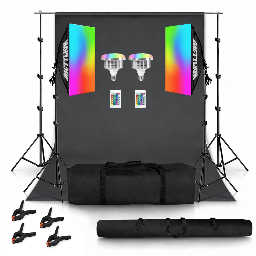 Acest set complet de studio este conceput pentru fotografie, video, livestream si productie continut online, oferind iluminare color reglabila si fundal negru profesional pentru cadre dramatice si moderne. Este ideal pentru creatori de continut, gaming setup, prezentari comerciale sau portrete artistice.