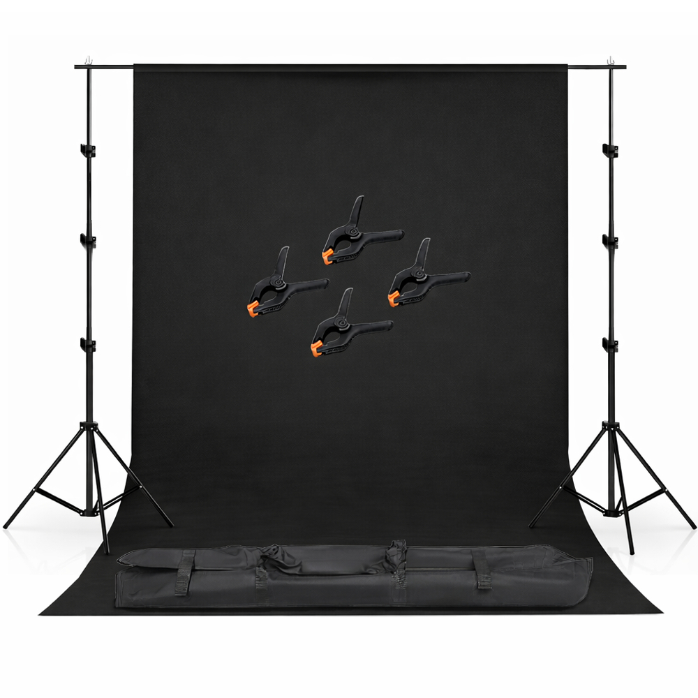 Kitul studio cu suport pentru fundal negru 2.6x3 m este o solutie eficienta pentru fotografie si filmare profesionala. Ideal pentru portrete, fotografie de produs sau continut video, acest sistem ofera un fundal uniform si elegant, potrivit pentru cadre dramatice sau minimaliste.