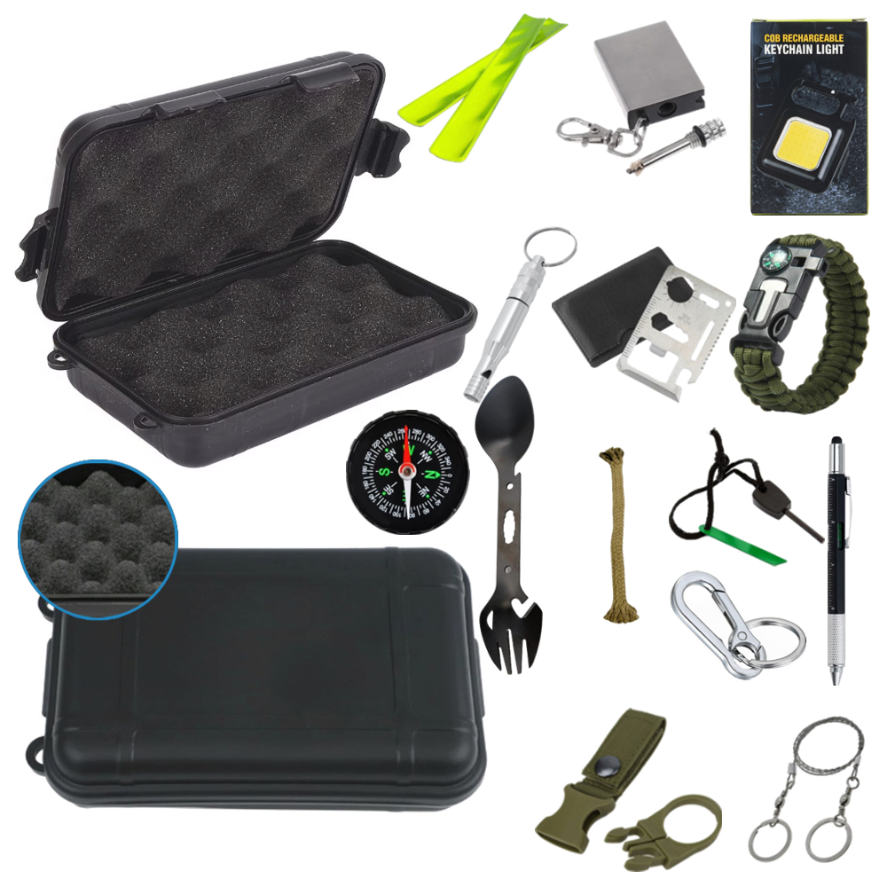 Kit supravietuire multifunctional outdoor Marime M 14 accesorii cutie etansa ABS IP54 18x11x5 cm negru camping urgente