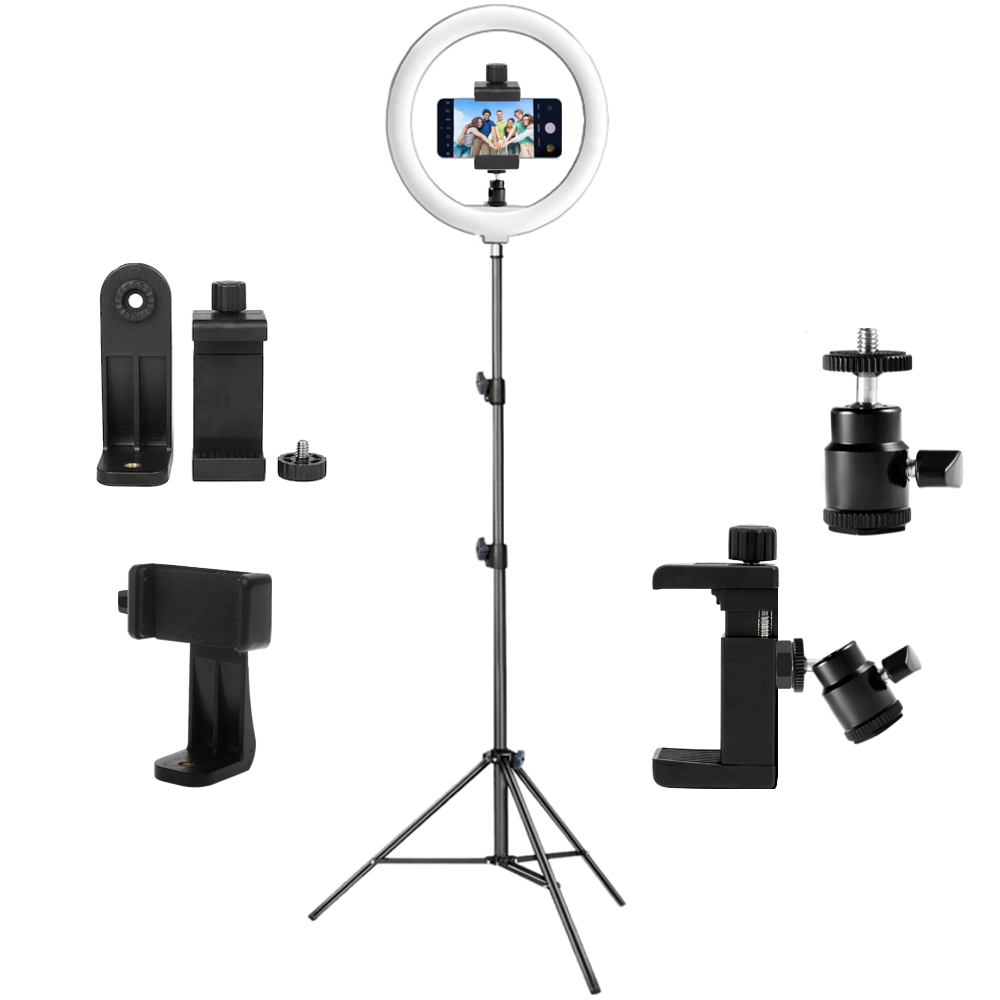 Sistem complet conceput pentru filmari cu telefonul mobil, ideal pentru vloguri, streaming live, tutoriale video, fotografie de produs sau continut pentru retele sociale. Kitul include un trepied stabil, realizat pentru utilizare in studio sau acasa, cu inaltime reglabila pana la aproximativ 200 cm, oferind libertate in alegerea cadrului si a unghiului de filmare.