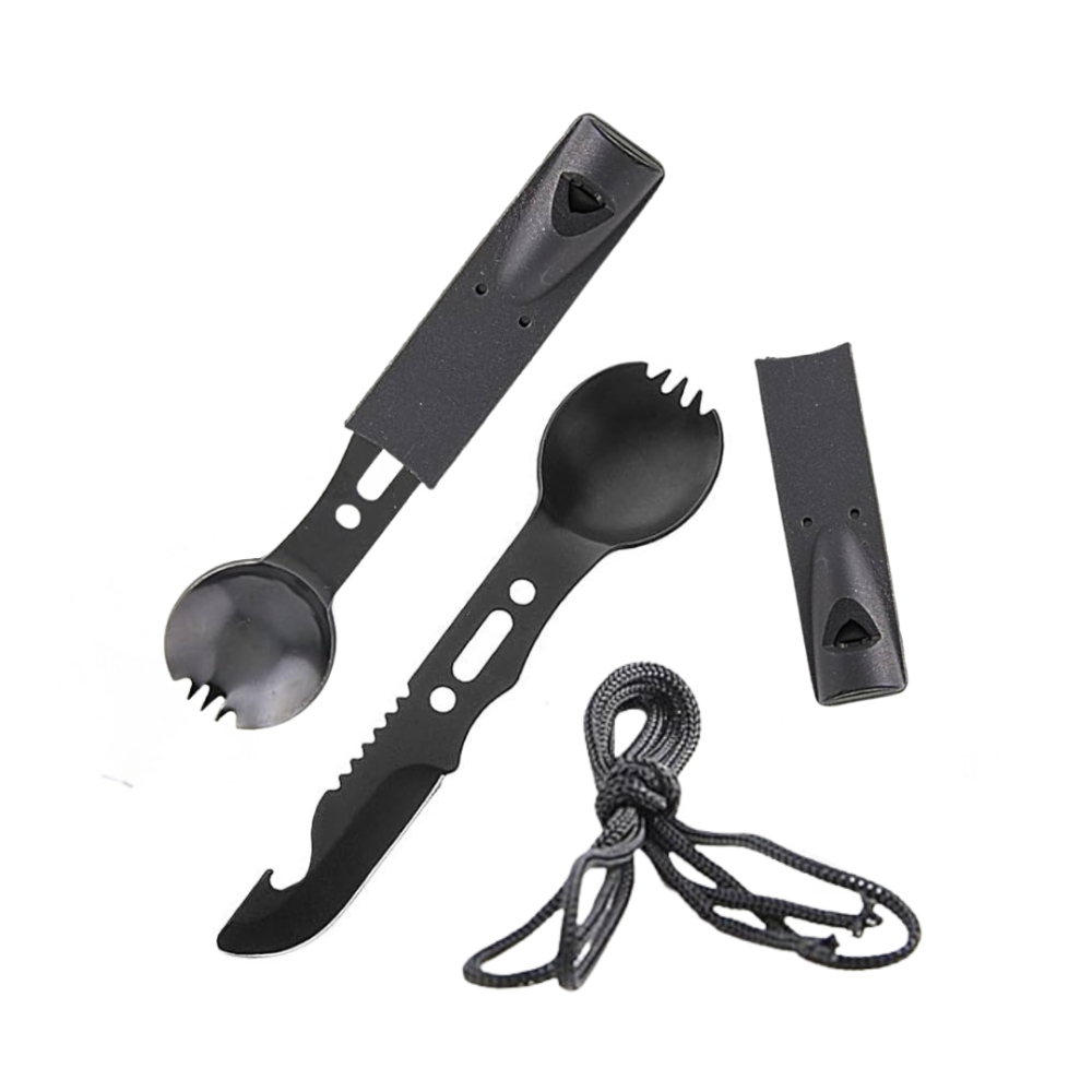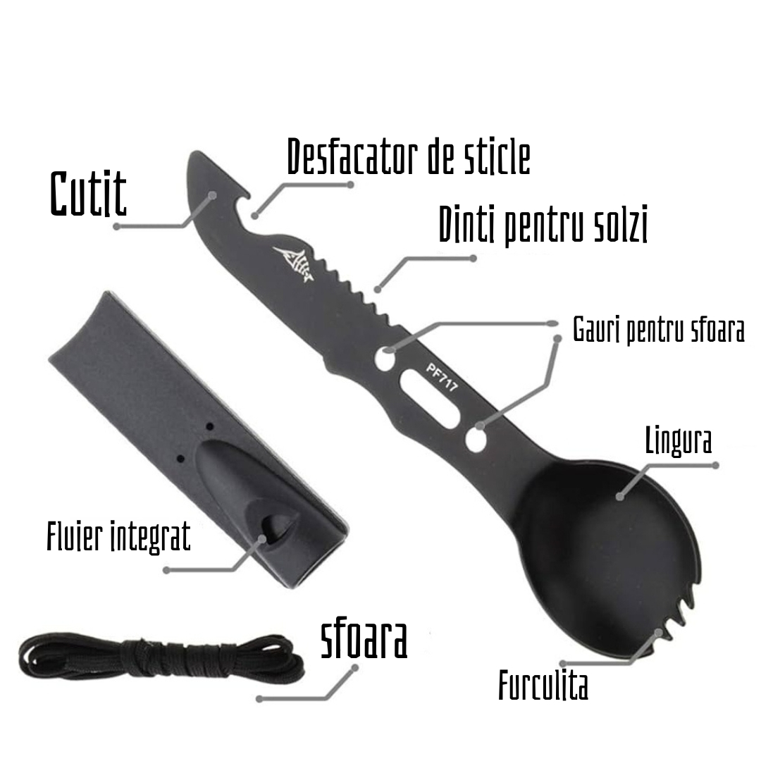 Designul inteligent include lingura pentru alimentatie, margini zimtate pentru taiere, deschizator, functie de taiere a sforii si alte elemente utile in mediul exterior. Constructia solida permite utilizarea in conditii dificile, iar forma plata si compacta o face ideala pentru rucsac, trusa de supravietuire sau echipament tactic.