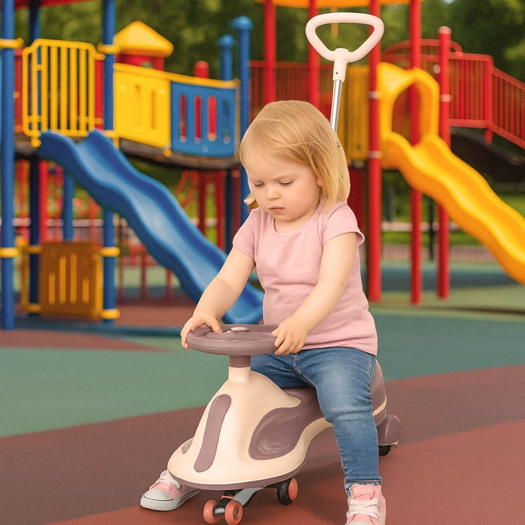 Mânerul din spate oferă părinților control complet asupra direcției și vitezei, făcând plimbările sigure și plăcute. Roțile din material durabil se mișcă lin și silențios pe orice tip de suprafață – podea, gresie sau asfalt – fără a zgâria sau deteriora solul.