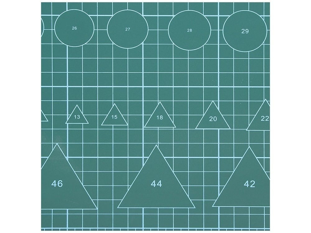 Placa este imprimata pe ambele fete si dispune de o grila milimetrica clara, cu marcaje bine definite si linii de ghidaj pentru unghiuri de 30°, 45° si 90°, ceea ce permite taieri exacte si control total in timpul lucrului. Datorita designului fata-verso, durata de viata este semnificativ extinsa – atunci cand o parte se uzeaza, placa poate fi intoarsa si utilizata in continuare cu aceeasi eficienta.