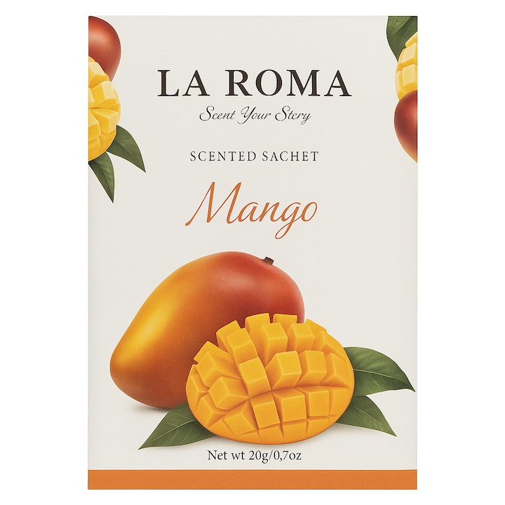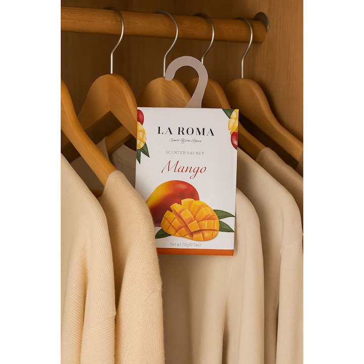 Daca iti doresti un parfum tropical proaspat si energizant in dulap, sertare sau masina, acest saculet parfumat cu aroma intensa de mango este alegerea perfecta. Notele sale fructate, dulci si vibrante improspateaza tesaturile si spatiile inchise, lasand un miros placut, exotic si persistent. Este ideal pentru dulapul de haine, sifonier, sertare, incaltaminte, masina, genti de voiaj sau spatii mici care necesita o reimprospatare delicata.