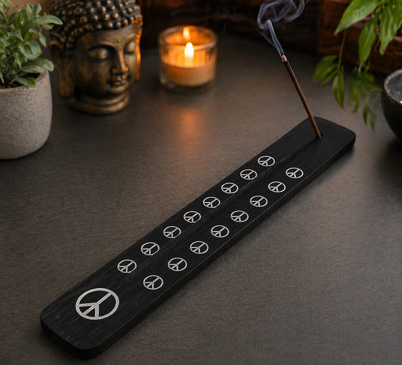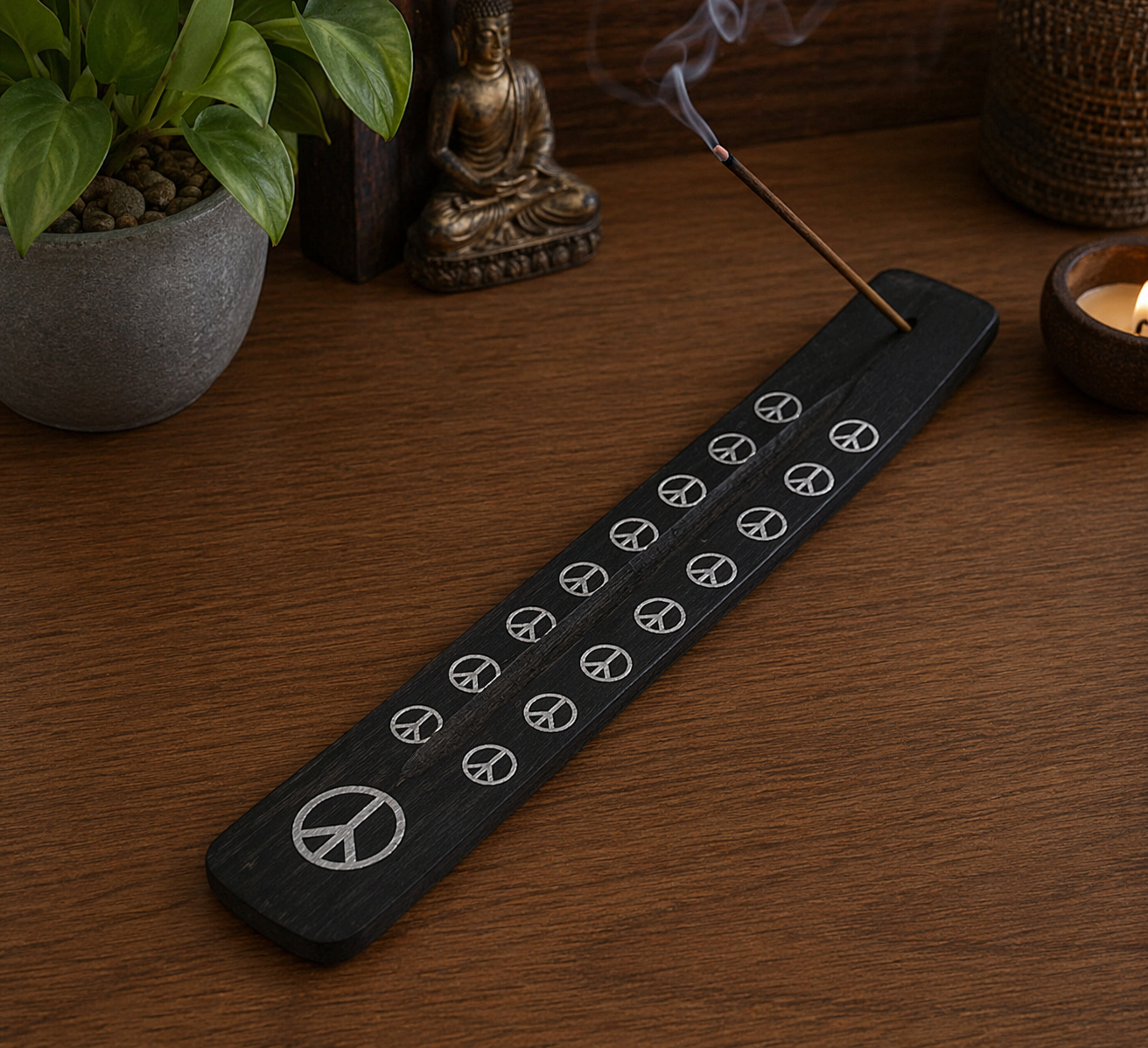 Suport betisoare parfumate din lemn, model simbol pace, lungime 26 cm, negru, suport ardere aromaterapie