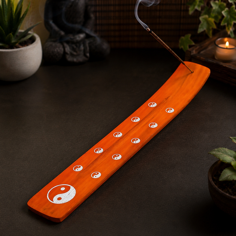 Suport betisoare parfumate din lemn, model Yin Yang, lungime 26 cm, portocaliu, suport ardere betisor aromaterapie