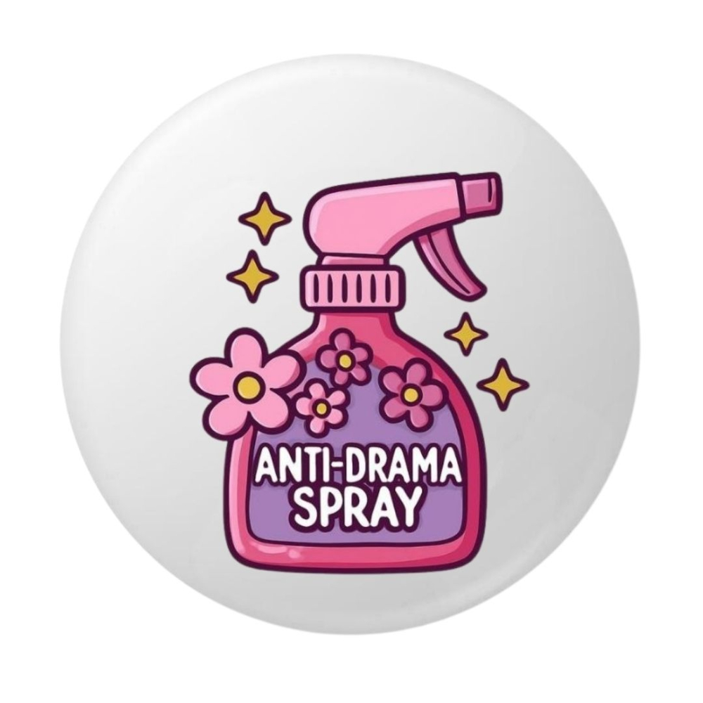 Insigna metalica rotunda de 58 mm prezinta un design ilustrat sub forma unui recipient stilizat cu mesajul „Anti-Drama Spray”. Grafica in nuante de roz si mov, completata de elemente decorative florale si simboluri stralucitoare, ofera un aspect jucaus si expresiv.
