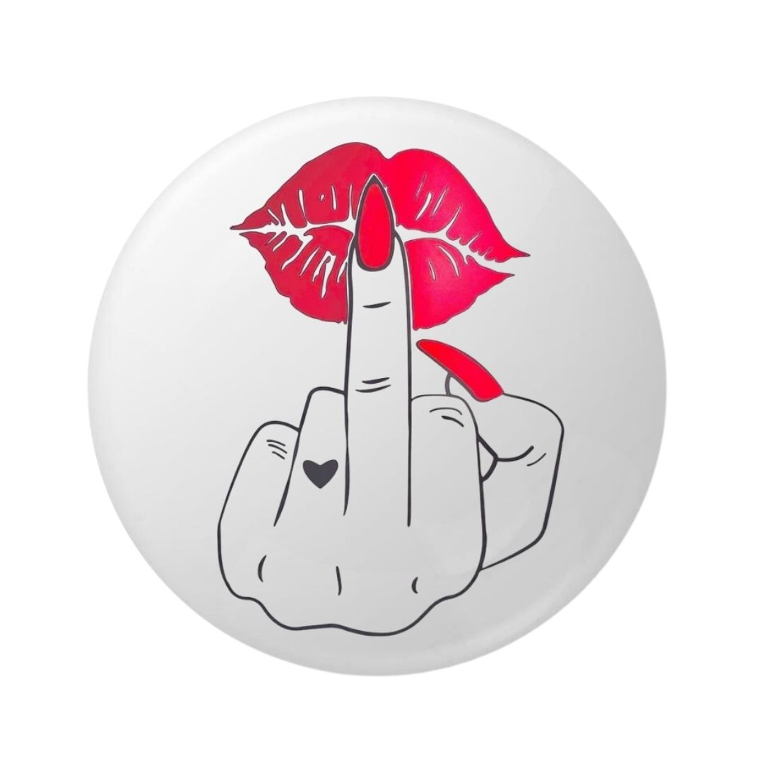 Insigna metalica rotunda de 58 mm prezinta o ilustratie grafica realizata in stil sketch, cu linii conturate in negru si accente cromatice intense in nuante de rosu. Designul combina elemente grafice expresive, oferind un contrast vizual puternic intre fundalul deschis si detaliile centrale.