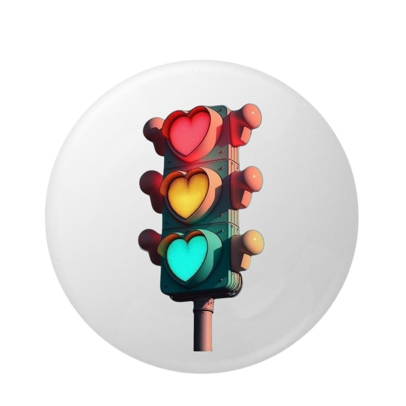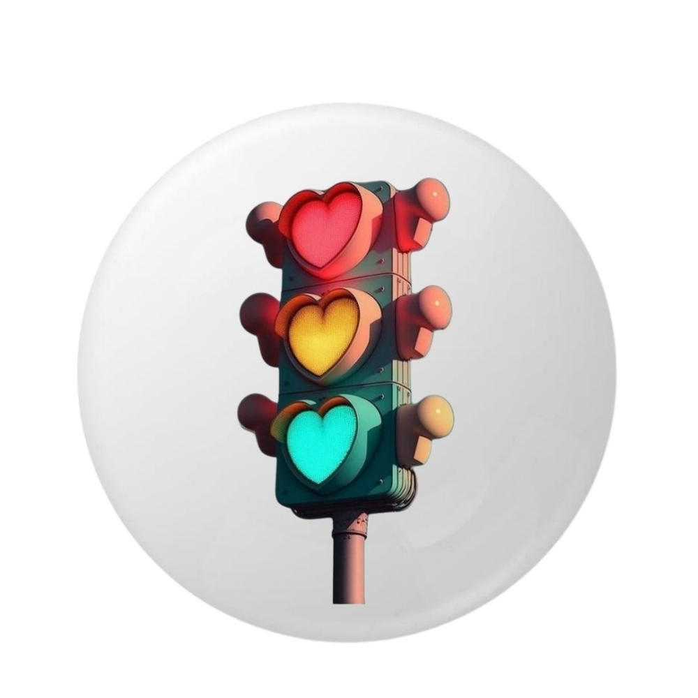 Insigna rotunda de 58 mm cu model semafor stilizat si inimi colorate este un accesoriu cu design modern si impact vizual puternic. Combinatia dintre elementul urban si simbolul iubirii creeaza un contrast interesant si expresiv.