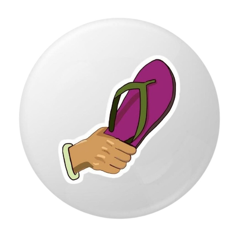 Insigna rotunda cu papuc si mana este un accesoriu cu mesaj umoristic, realizat intr-un stil grafic simplu si expresiv. Ilustratia reprezinta o mana care tine un papuc mov, element asociat in mod traditional cu ideea de avertisment amuzant sau replica ironica.