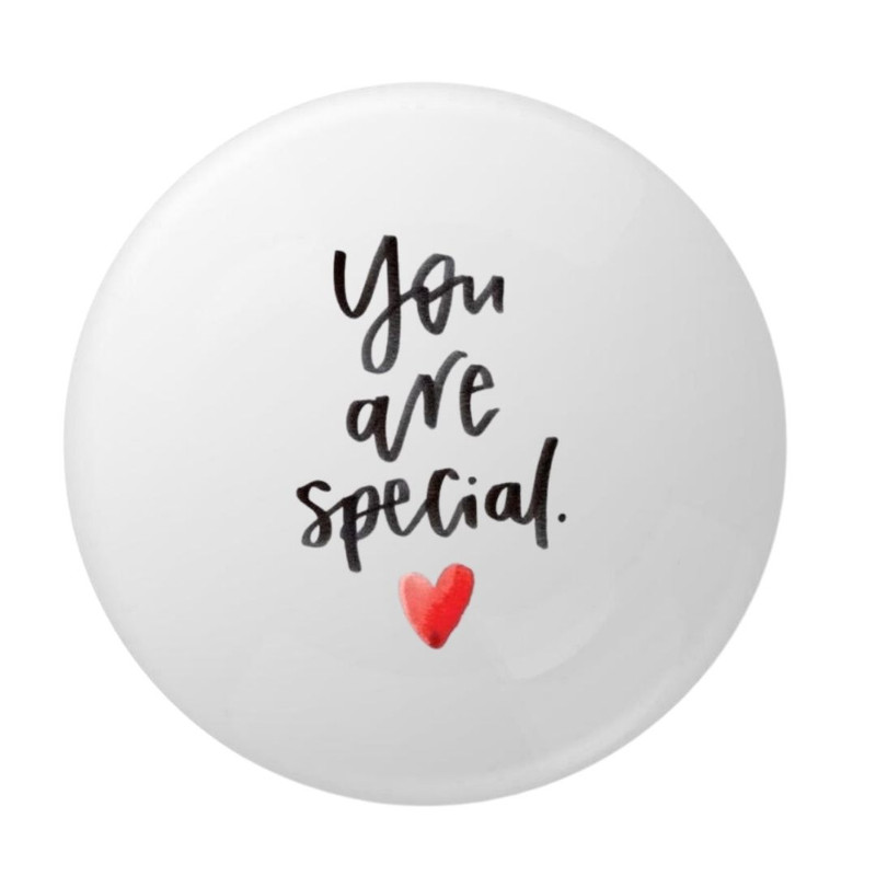 Aceasta insigna rotunda transmite un mesaj cald si sincer prin textul „You are special.”, completat de o mica inima rosie pozitionata discret sub mesaj. Designul minimalist, cu scris de tip caligrafic negru pe fundal alb, ofera un aspect elegant si usor de integrat in orice stil vestimentar.