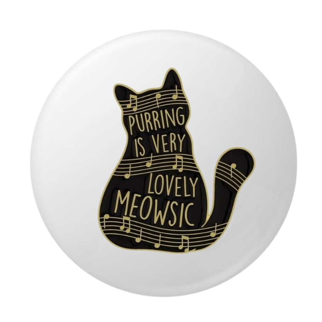 Dactylion Insigna rotunda cu pisica si mesaj Purring is very lovely meowsic, 58 mm, prindere cu ac metalic