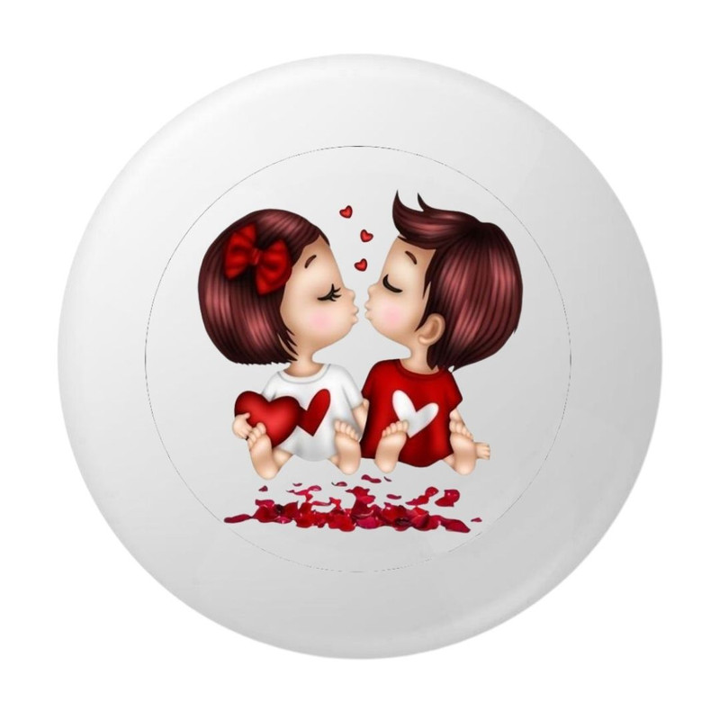 Aceasta insigna rotunda de 58 mm prezinta un design adorabil cu doi copii stilizati care se saruta, inconjurati de inimioare rosii. Ilustratia are un aspect delicat si jucaus, accentuat de detalii precum fundita rosie si inimile tinute in maini.