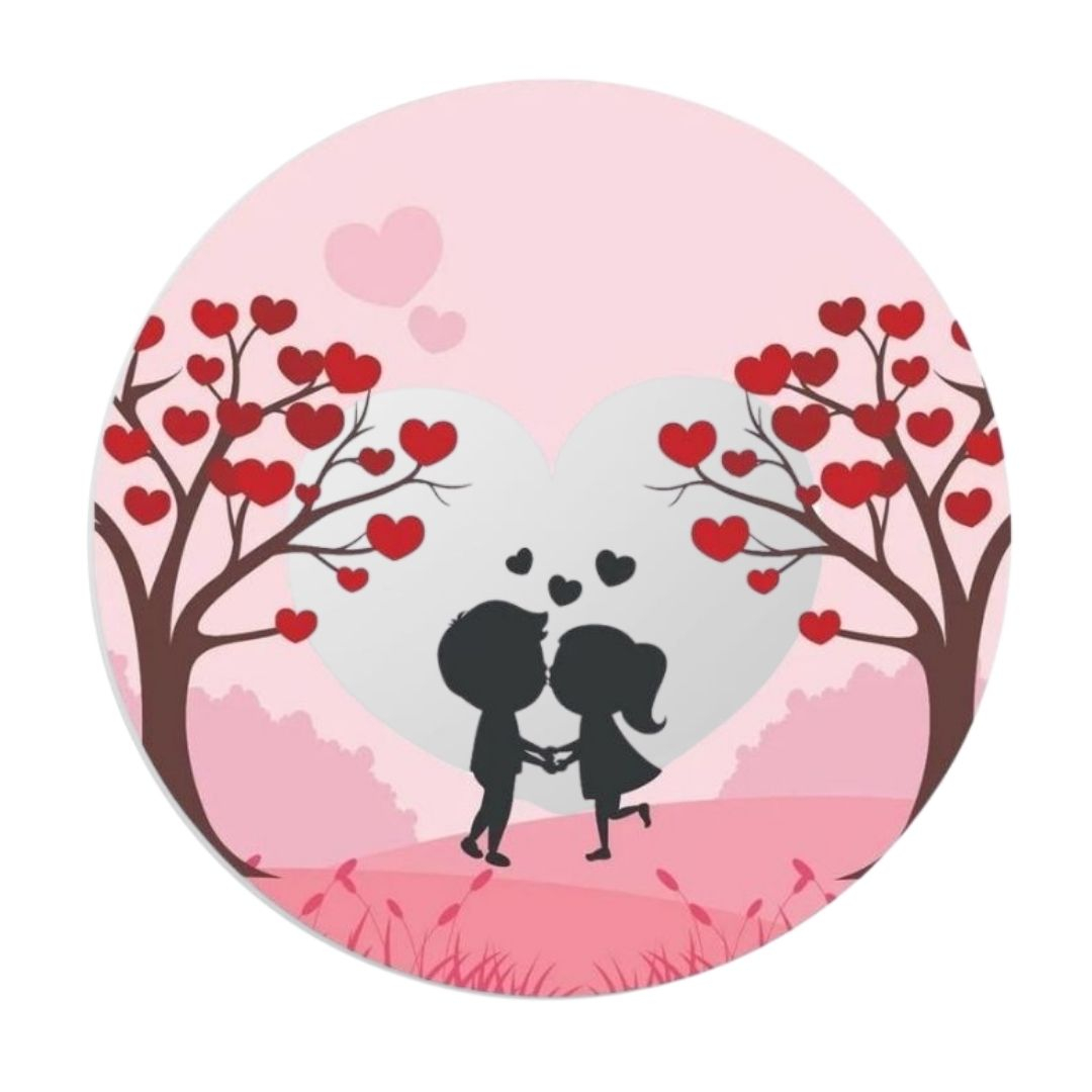 Aceasta insigna rotunda de 58 mm prezinta un design delicat si romantic, cu silueta unui cuplu care se tine de mana, incadrat de doi copaci ale caror ramuri sunt decorate cu inimioare rosii. Fundalul pastel in nuante de roz completeaza armonios compozitia si accentueaza atmosfera de poveste.