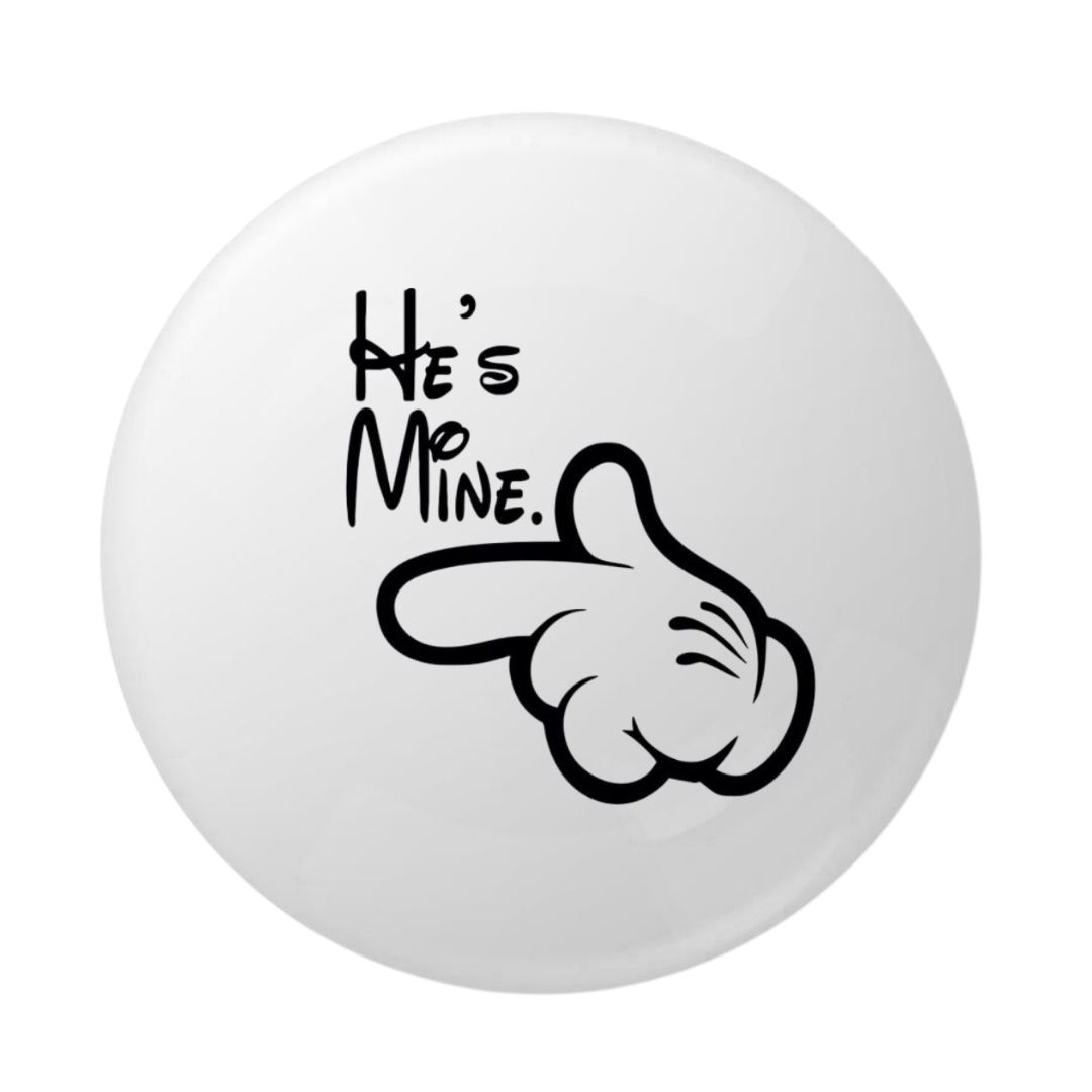Insigna rotunda He’s Mine cu mana stilizata, mesaj indraznet, 58 mm, prindere cu ac