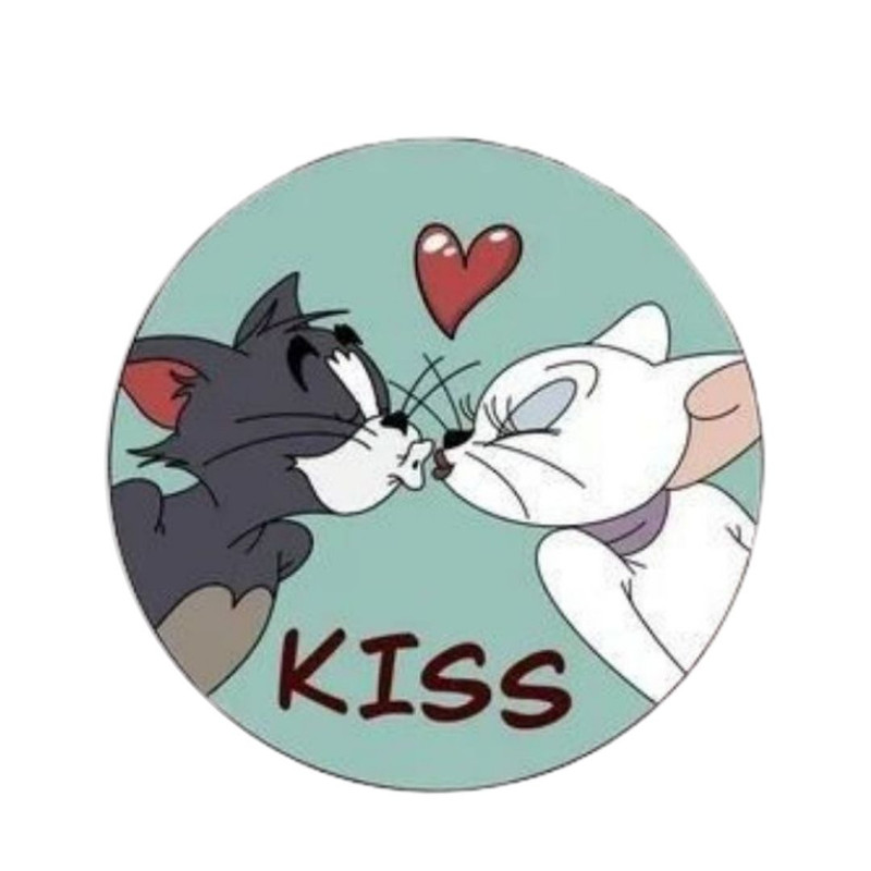 Insigna rotunda Kiss de 58 mm prezinta un design romantic cu doua pisici care se saruta sub o inimioara rosie. Stilul animat si expresiv transmite tandrete si emotie, fiind potrivit pentru cadouri simbolice.