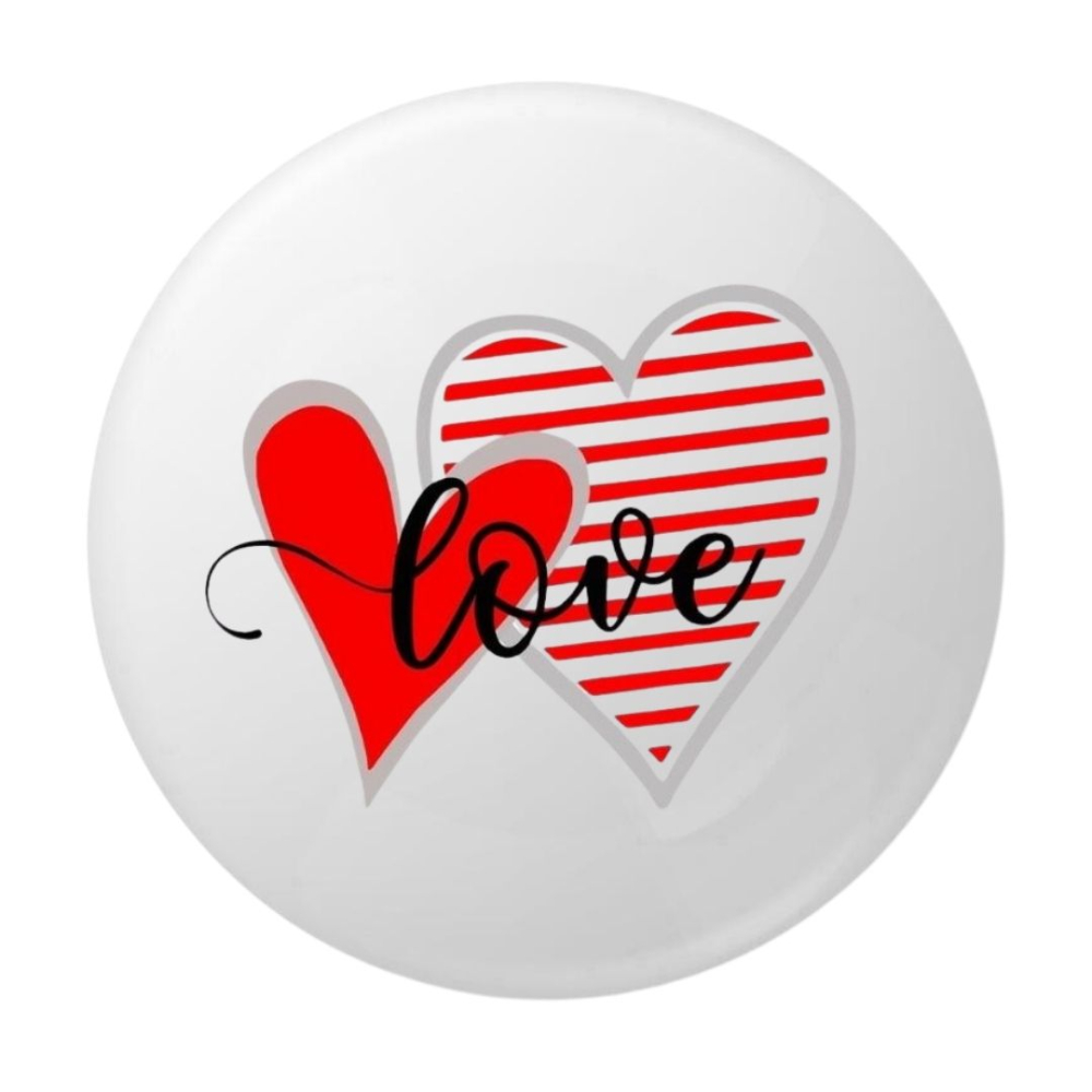 Aceasta insigna rotunda de 58 mm prezinta un design modern si echilibrat, cu doua inimi rosii stilizate suprapuse, una plina si una cu dungi orizontale. Mesajul Love este scris cursiv peste compozitie, oferind un efect vizual elegant si contemporan.